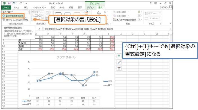 (3)「森下」さんの線をクリックしても選択されますが、この方法でも選択できるのです。さてここで[選択対象の書式設定]を使いましょう。{Ctrl}+{1}キーでも同じ効果があります。