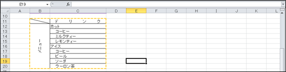 (04) ここでドリンクメニューのタイトル行(11行目)も「太点線」「オレンジ」で囲ませます。選択して{F4}キーを押します。直前の命令が繰り返されます。
