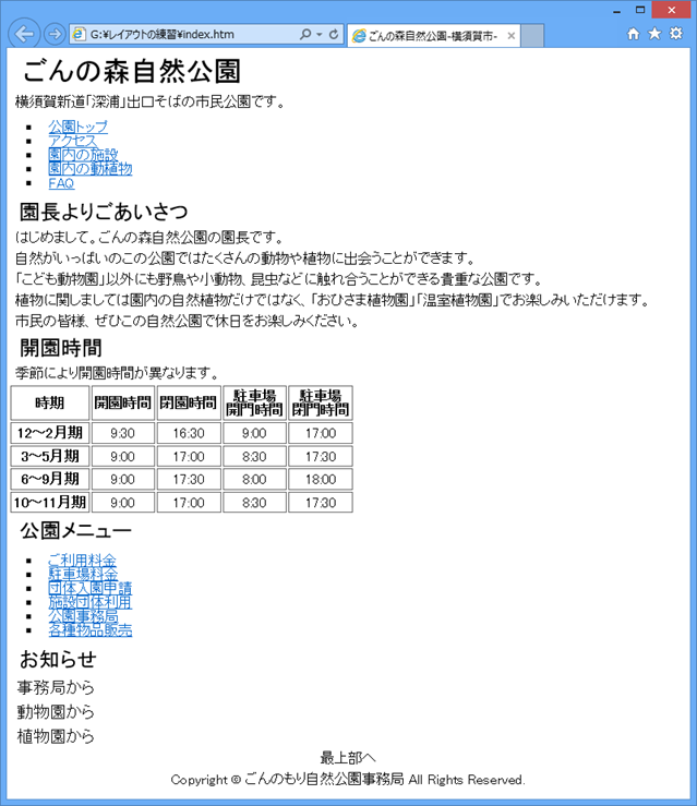 <?xml version="1.0" encoding="Shift_JIS"?> <!DOCTYPE html PUBLIC "-//W3C//DTD XHTML 1.0 Transitional//EN" "http://www.w3.org/TR/xhtml1/DTD/xhtml1-transitional.dtd"> <html xmlns="http://www.w3.org/1999/xhtml" xml:lang="ja" lang="ja"> <head> <meta http-equiv="Content-Language" content="ja" /> <meta http-equiv="Content-Type" content="text/html; charset=shift_jis" /> <link rel="stylesheet" type="text/css" href="nor.css" /> <link rel="stylesheet" type="text/css" href="str.css" /> <title>ごんの森自然公園-横須賀市-</title> </head> <body> <div class="secall"> <div class="sechead"> <h1>ごんの森自然公園</h1> <p>横須賀新道「深浦」出口そばの市民公園です。</p> </div> <!--secheadの閉じタグ--> <ul class="glvnavi"> <li><a href="xx.htm">公園トップ</a></li> <li><a href="xx.htm">アクセス</a></li> <li><a href="xx.htm">園内の施設</a></li> <li><a href="xx.htm">園内の動植物</a></li> <li><a href="xx.htm">FAQ</a></li> </ul> <div class="main"> <div class="seccontent"> <h2>園長よりごあいさつ</h2> <p>はじめまして。ごんの森自然公園の園長です。</p> <p>自然がいっぱいのこの公園ではたくさんの動物や植物に出会うことができます。</p> <p>「こども動物園」以外にも野鳥や小動物、昆虫などに触れ合うことができる貴重な公園です。</p> <p>植物に関しましては園内の自然植物だけではなく、「おひさま植物園」「温室植物園」でお楽しみいただけます。</p> <p>市民の皆様、ぜひこの自然公園で休日をお楽しみください。</p> <h2>開園時間</h2> <p>季節により開園時間が異なります。</p> <table summary="自然公園開園時間"> <tr> <th>時期</th> <th>開園時間</th> <th>閉園時間</th> <th>駐車場<br />開門時間</th> <th>駐車場<br />閉門時間</th> </tr> <tr> <th>12~2月期</th> <td>9:30</td> <td>16:30</td> <td>9:00</td> <td>17:00</td> </tr> <tr> <th>3~5月期</th> <td>9:00</td> <td>17:00</td> <td>8:30</td> <td>17:30</td> </tr> <tr> <th>6~9月期</th> <td>9:00</td> <td>17:30</td> <td>8:00</td> <td>18:00</td> </tr> <tr> <th>10~11月期</th> <td>9:00</td> <td>17:00</td> <td>8:30</td> <td>17:30</td> </tr> </table> </div> <!--seccontentの閉じタグ--> <div class="secsubmenu01"> <h2>公園メニュー</h2> <ul> <li><a href="xx.htm">ご利用料金</a></li> <li><a href="xx.htm">駐車場料金</a></li> <li><a href="xx.htm">団体入園申請</a></li> <li><a href="xx.htm">施設団体利用</a></li> <li><a href="xx.htm">公園事務局</a></li> <li><a href="xx.htm">各種物品販売</a></li> </ul> </div> <!--secsubmenu01の閉じタグ--> <div class="secsubmenu02"> <h2>お知らせ</h2> <h3>事務局から</h3> <h3>動物園から</h3> <h3>植物園から</h3> </div> <!--secsubmenu02の閉じタグ--> </div> <!--mainの閉じタグ--> <div class="secfoot"> <p>最上部へ</p> <p>Copyright © ごんのもり自然公園事務局 All Rights Reserved.</p> </div> <!--secfootの閉じタグ--> </div> <!--secallの閉じタグ--> </body> </html>