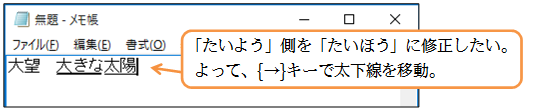 (04)「たいよう」の文節が「よみ・ひらがな」/波下線になりました。これで「よみ」を修正できます。{←}キーで「よ」の右にカーソルを移動してから消し、「ほ」を追加入力しましょう。