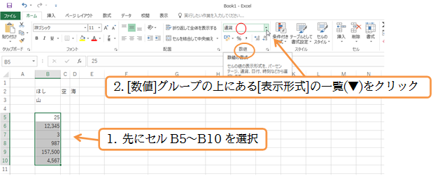 (01)セルB5~B10の表示形式を元に戻します。最初の状態は「標準」です。[桁区切りスタイル]や[通貨表示形式]ボタンの上にある[表示形式](