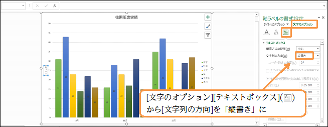 (04)最後に左の数値軸のさらに左に文字ラベル「販売台数」を作成します。