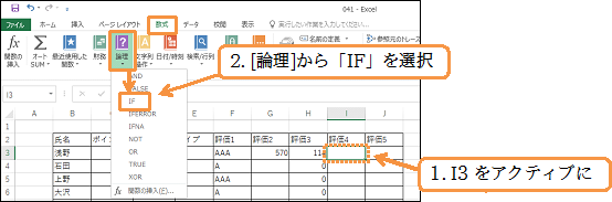 (03)しかしこのままだとエラー値が表示されます。「い」は文字データなので「”い”」としなければなりません。[真の場合・偽の場合]においては、「”」で囲んでいない文字データは自動的に囲まれましたが[論理式]欄では自動的には囲まれないのです。
