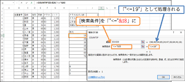 (02)[範囲]には「E3:E20」を指定します。[検索条件]には「19以下」を指定するつもりです。「”<=19″」と指定してもよいのですが式を下へコピーすることを考えて「19」の部分にはセルI8を利用するつもりです。まずは「19」部分は後回しにして「”<=”」だけを指定してください。