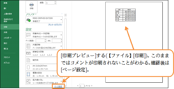 コメントを印刷させるには[ページ設定]ダイアログボックスから設定します。